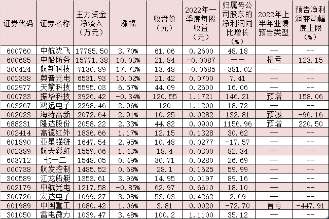 表:7月27日受到超千萬元主力資金追捧的國防軍工股