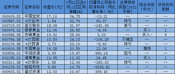 表:7月21日至8月11日期間,黃金概念板塊期間累計漲幅超10%個股一覽