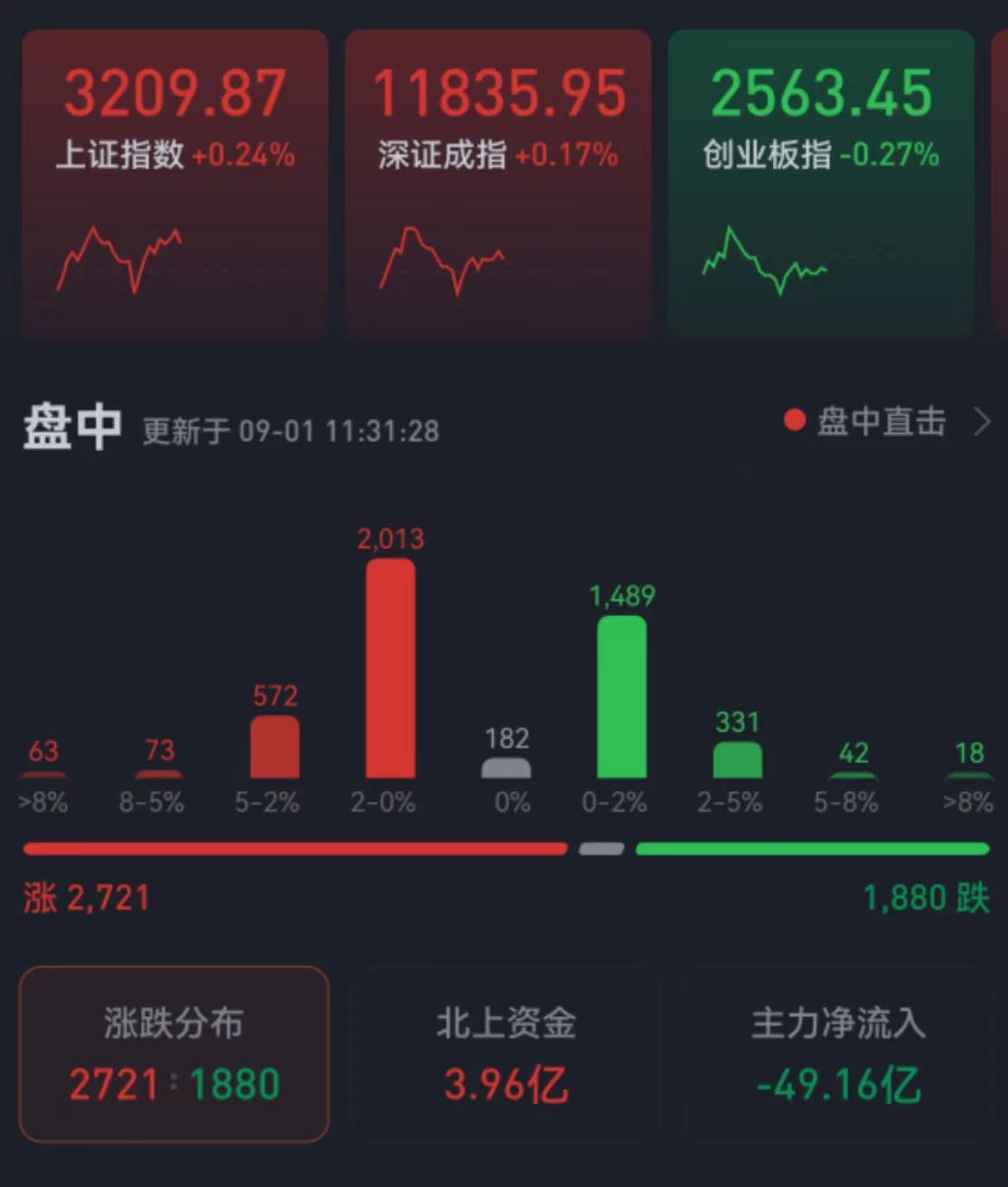 周四(9月1日),三大股指震蕩分化,漲跌不一。截至上午收盤,上證指數(shù)漲幅達0.24%,報3209.87點;深證成指漲幅為0.17%,創(chuàng)業(yè)板指微跌0.27%;滬深兩市合計成交額4858.4億元,總體來看,兩市個股漲多跌少。