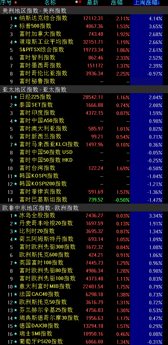 上周美股三大指數(shù)上漲,道指周漲2.66%;標(biāo)普500指數(shù)周漲3.65%;納指周漲4.14%。歐洲方面,三大股指周線上漲,英國富時100指數(shù)周累計漲0.96%,德國DAX30指數(shù)周累計漲0.29%,法國CAC40指數(shù)周累計漲0.73%。亞太股市,日經(jīng)225指數(shù)周累計漲2.04%;韓國KOSPI指數(shù)周累計跌1.04%。