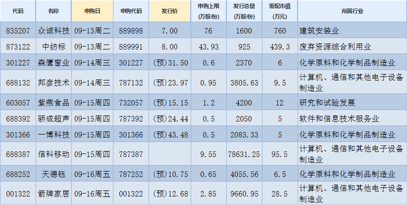 新股方面,根據(jù)發(fā)行安排,A股市場本周(9月13日-9月16日)將有10只新股申購。