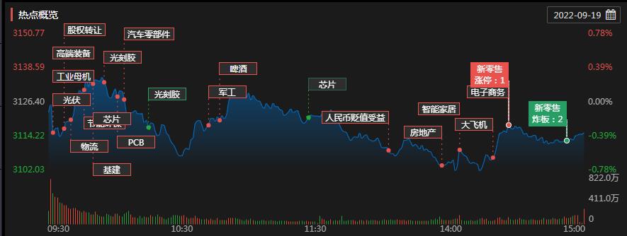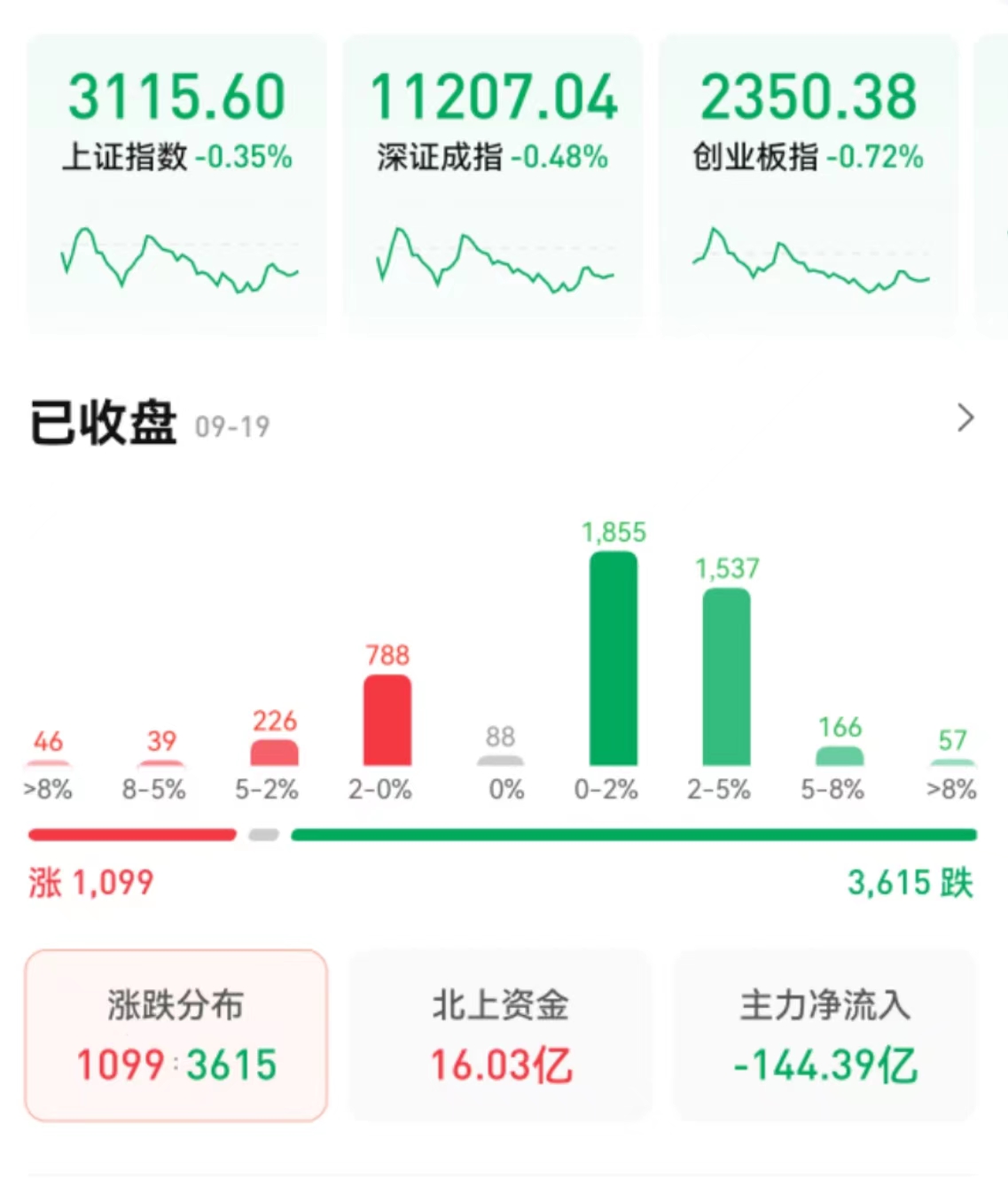 9月19日,A股三大指數(shù)震蕩回落,集體收跌。截至收盤(pán),上證指數(shù)跌0.35%報(bào)3115.6點(diǎn),深證成指跌0.48%報(bào)11207.04點(diǎn),創(chuàng)業(yè)板指跌0.72%報(bào)2350.38點(diǎn),走出了日線(xiàn)五連陰的態(tài)勢(shì)。兩市合計(jì)成交6653億元,成交額創(chuàng)年內(nèi)新低??傮w來(lái)看,A股個(gè)股跌多漲少,上漲個(gè)股為1099只,下跌個(gè)股3615只。