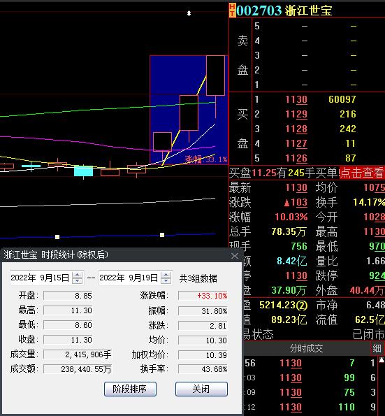 9月19日,熱門(mén)股浙江世寶再度漲停,截至收盤(pán),報(bào)11.30元,實(shí)現(xiàn)3連板,累計(jì)漲幅達(dá)33.1%。