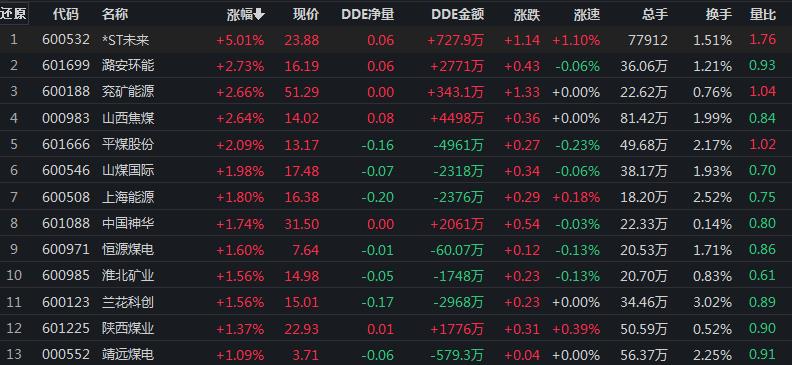 9月19日,煤炭行業(yè)漲幅居首達(dá)1.11%.其中,*ST未來(lái)漲停。
