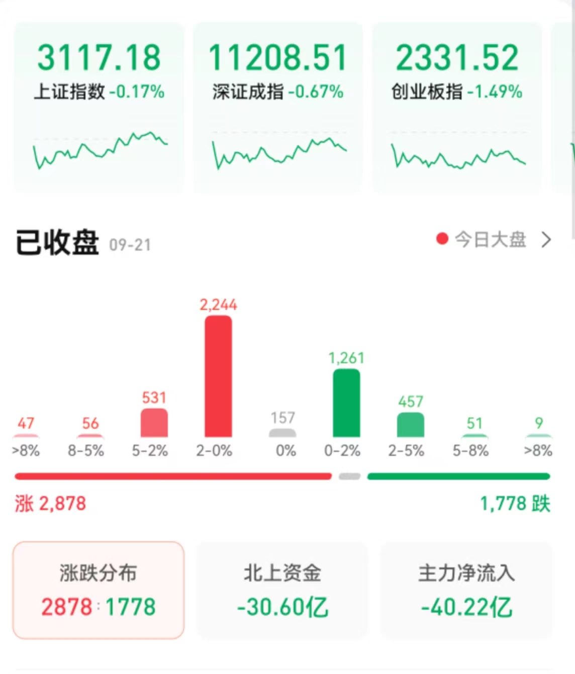 9月21日,A股三大指數(shù)震蕩回落,集體收跌。截至收盤,上證指數(shù)微跌0.17%報3117.18點(diǎn),深證成指跌0.67%報11208.51點(diǎn),創(chuàng)業(yè)板指跌1.49%報2331.52點(diǎn),兩市合計成交6359億元,北向資金凈賣出30.6億元??傮w來看,A股個股漲多跌少。