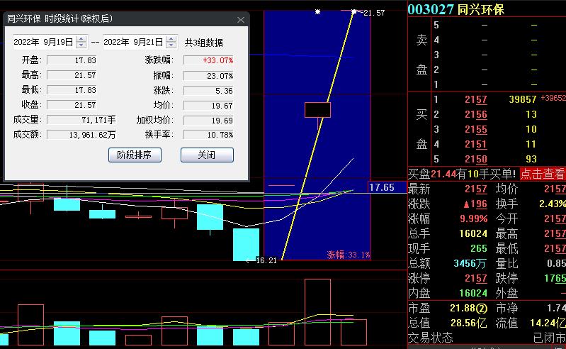 9月21日,熱門股同興環(huán)保再度漲停,截至收盤,報收21.57元,實現(xiàn)3連板,累計漲幅達(dá)33.07%。