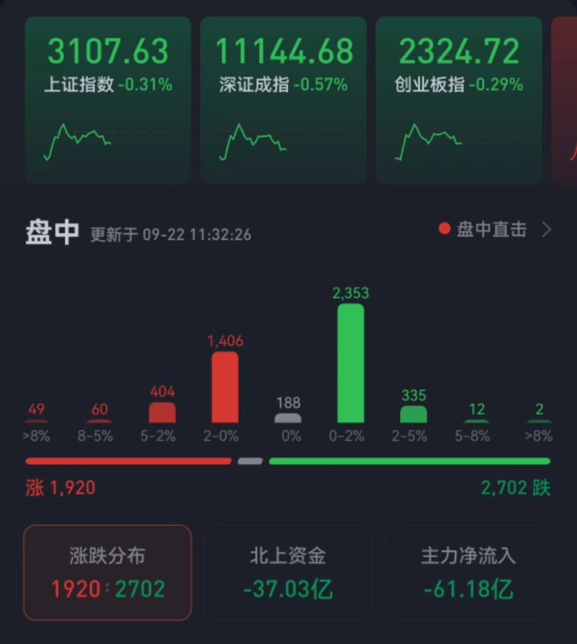 周四,中國三大股指低開后震蕩走強(qiáng),全線收綠。截至上午收盤,上證指數(shù)跌0.31%,盤中一度失守3100點(diǎn);深證成指和創(chuàng)業(yè)板指跌幅分別為0.57%和0.29%;滬深兩市合計(jì)成交額4032.7億元,總體來看,兩市個(gè)股跌多漲少。