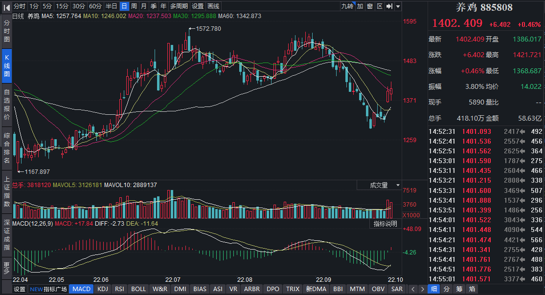 “十一長假期間,歐洲禽流感出現(xiàn)加速跡象,捕殺大量的活雞,同時也影響到了祖代引種量,導致接下來肉雞出欄數(shù)量下降,造成肉雞供應偏緊的局面,從而帶動肉雞價格維持高位運行,導致養(yǎng)雞板塊的走強。”排排網(wǎng)財富研究部副總監(jiān)劉有華告訴《證券日報》記者。