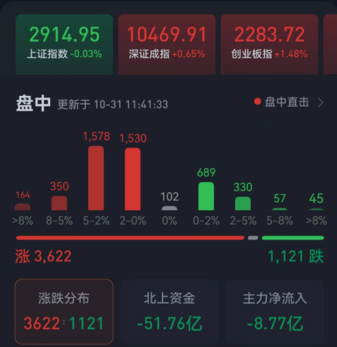 周一(10月31日),三大股指震蕩分化,漲跌不一。截至上午收盤,上證指數(shù)下跌0.03%,報(bào)2914.95點(diǎn);深證成指和創(chuàng)業(yè)板指漲幅分別為0.65%和1.48%;滬深兩市合計(jì)成交額5808.76億元,總體來(lái)看,兩市個(gè)股漲多跌少。