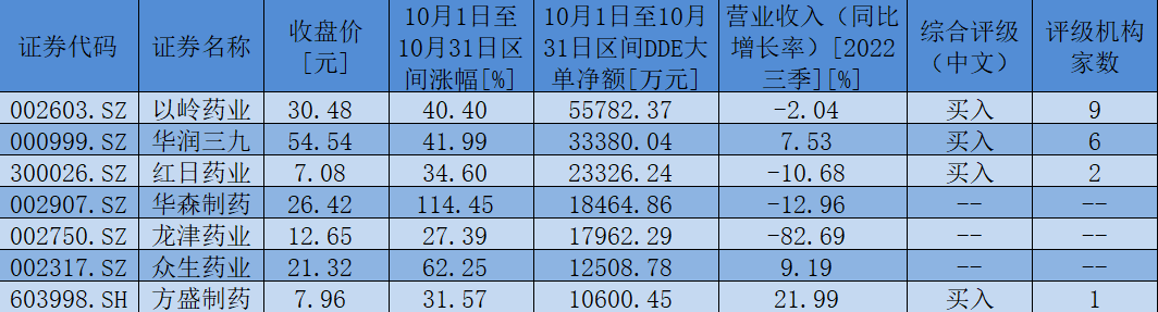 當(dāng)然,資金也是推動(dòng)中藥板塊上漲的重要因素,大單資金正積極搶籌部分中藥板塊個(gè)股。10月1日至10月31日,該板塊共有31只個(gè)股獲得大單資金凈流入,凈流入額達(dá)到24.25億元;其中,大單資金對(duì)以嶺藥業(yè)、華潤(rùn)三九、紅日藥業(yè)、華森制藥、龍津藥業(yè)、眾生藥業(yè)、方盛制藥的凈流入額均超1億元。