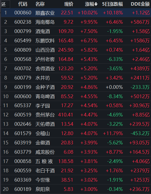 從早盤表現(xiàn)強(qiáng)勢(shì)的飲料制造行業(yè)看,截至11月1日11:30,該行業(yè)交易中的47只個(gè)股有46只上漲,占比97.87%,其中8只漲幅超5%。從資金流向看,該行業(yè)今天上午大單資金凈流入額達(dá)22.73億元,居行業(yè)第2位。