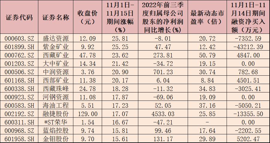 表:11月1日至11月15日期間漲幅超15%的采礦板塊內(nèi)個(gè)股一覽