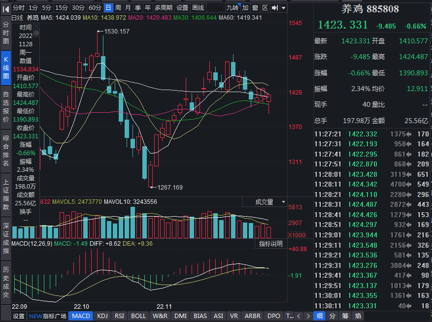 在雞苗及肉雞價格持續(xù)高位帶動下,同花順養(yǎng)雞概念板塊本月表現(xiàn)十分突出。同花順數(shù)據(jù)顯示,11月1日至11月25日,養(yǎng)雞板塊指數(shù)期間累計上漲9.83%,跑贏上證指數(shù)(期間累計漲幅7.2%)。板塊內21只個股中共有19只實現(xiàn)上漲,占比超九成。個股方面,包括益生股份、禾豐股份、曉鳴股份、民和股份、圣農發(fā)展等在內的8只個股期間累計漲幅均超10%。