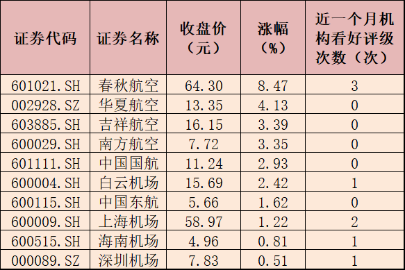 最近一個(gè)月,有機(jī)構(gòu)對(duì)于部分機(jī)場航運(yùn)概念股表示看好,具體來看,有5只個(gè)股獲機(jī)構(gòu)給予“買入”或“增持”等看好評(píng)級(jí),其中,春秋航空獲得看好評(píng)級(jí)次數(shù)最多,為3次,上海機(jī)場、白云機(jī)場、海南機(jī)場、深圳機(jī)場獲得看好評(píng)級(jí)次數(shù)分別為2次、1次、1次、1次。
