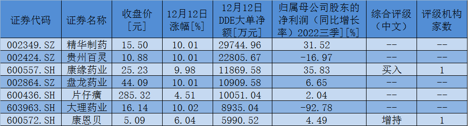 表:12月12日,獲大單資金凈流入額超5000萬元的中藥板塊個股一覽