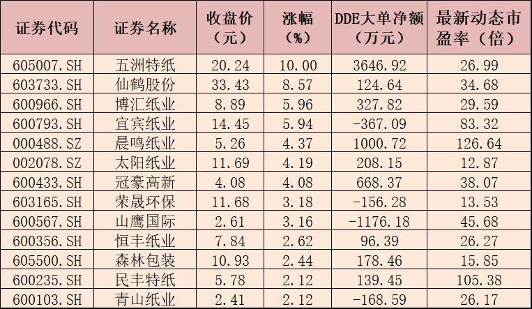 表:12月13日漲幅超2%的造紙股一覽