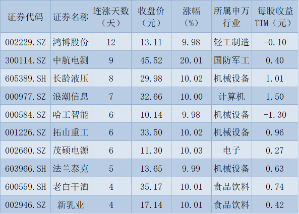 表:連續(xù)上漲4日且今日收盤漲停股一覽
