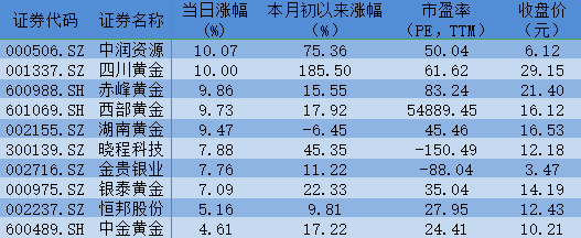 表:3月20日A股貴金屬板塊漲幅前十位個(gè)股一覽: