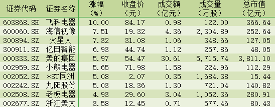 表:今日家用電器行業(yè)漲幅前十個股一覽