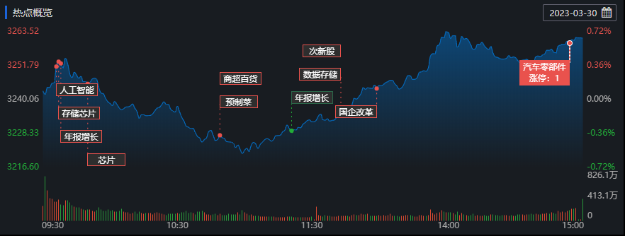 3月30日,A股三大指數走出”V”字反轉,集體收漲,滬指結束四連跌。截至收盤,上證指數漲0.65%報3261.25點;深證成指漲0.62%報11651.83點,創(chuàng)業(yè)板指漲0.50%報2383.04點,A股合計成交額9448.25億元,較上個交易日下降3.75%;北向資金全天凈買入48.07億元;其中滬股通凈買入23.91億元,深股通凈買入24.16億元。今日A股中有2949只下跌,1933只上漲。