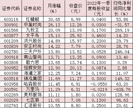 5月份以來,截至5月15日,紡織服裝板塊集體崛起,其整體漲4.56%,跑贏上證指數(shù)(月內累計跌0.38%)。其中,17只個股月內累計漲幅超10%,紅蜻蜓、中胤時尚、九牧王等3只個股期間累計漲幅居前,均超20%。