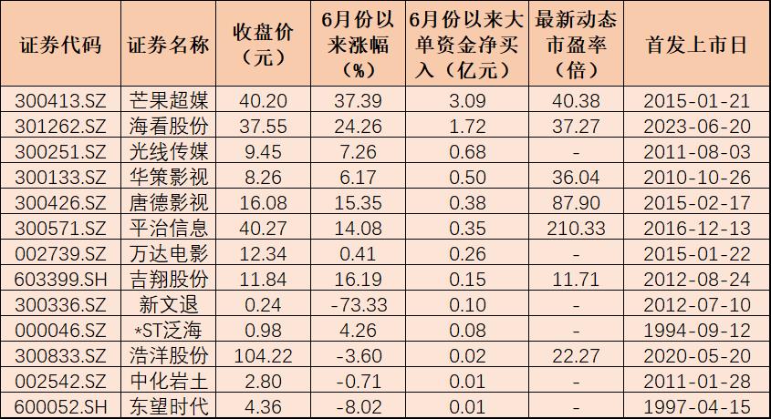 表:6月份以來(lái)大單資金凈買入的影視概念股一覽