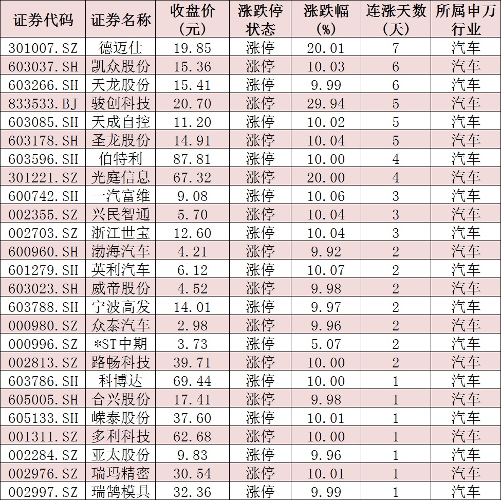 具體來(lái)看,今日,汽車(chē)產(chǎn)業(yè)鏈徹底爆發(fā),掀起了罕見(jiàn)的漲停潮,其中,胎壓監(jiān)測(cè)板塊領(lǐng)漲,路暢科技等5只個(gè)股漲停;新能源汽車(chē)概念股持續(xù)強(qiáng)勢(shì),包括德邁仕、英利汽車(chē)等多只概念股漲停;無(wú)人駕駛板塊持續(xù)走強(qiáng),得潤(rùn)電子等16只概念股漲停;汽車(chē)零部件股集體走強(qiáng),圣龍股份等23只個(gè)股漲停;創(chuàng)新藥概念股午后異動(dòng),海思科、通化金馬漲停;EDR概念、華為汽車(chē)、減速器、汽車(chē)芯片、車(chē)聯(lián)網(wǎng)、傳感器、英偉達(dá)概念、第三代半導(dǎo)體等板塊表現(xiàn)活躍。中船系板塊領(lǐng)跌,芬太尼、醫(yī)藥商業(yè)、毛發(fā)醫(yī)療、醫(yī)藥電商、房地產(chǎn)服務(wù)、電力、教育、銀行等板塊跌幅居前。