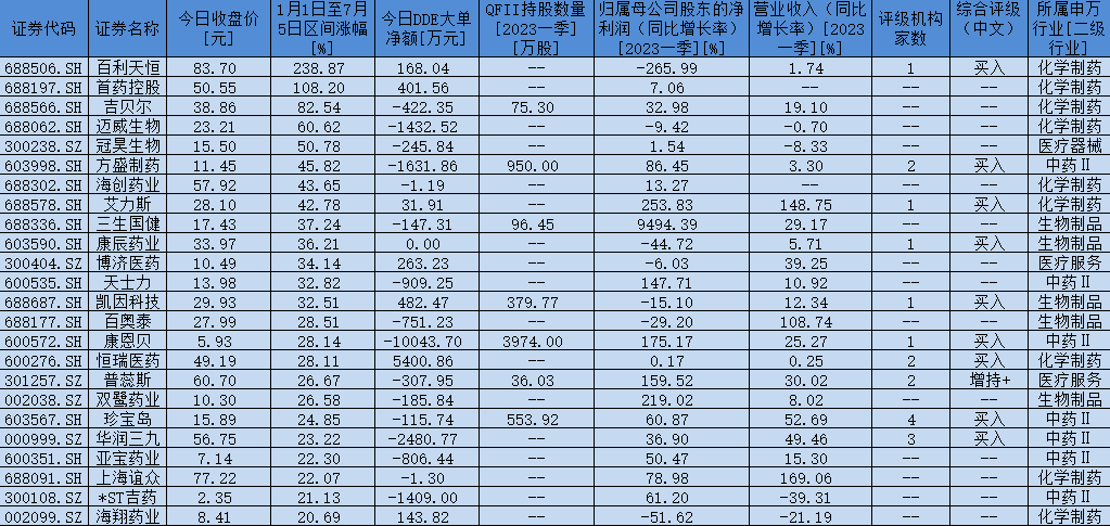 表:2023年1月1日至7月5日,創(chuàng)新藥板塊期間累計(jì)上漲超20%個(gè)股一覽