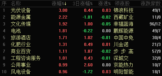 東方財(cái)富行業(yè)方面,截至7月10日11:30,86個(gè)行業(yè)板塊中53個(gè)上漲,占比61.63%。其中,光伏設(shè)備行業(yè)漲幅居前,達(dá)3.00%,此外,包括能源金屬、文化傳媒和電池等在內(nèi)的7個(gè)行業(yè)漲幅均超1%。下跌方面,保險(xiǎn)行業(yè)居首,跌幅達(dá)1.44%,此外,電機(jī)行業(yè)跌幅也超1%。從資金流向的行業(yè)看,排名前十的以能源電力為主,光伏設(shè)備、電池、能源金屬、風(fēng)電設(shè)備、電源設(shè)備等占5席。