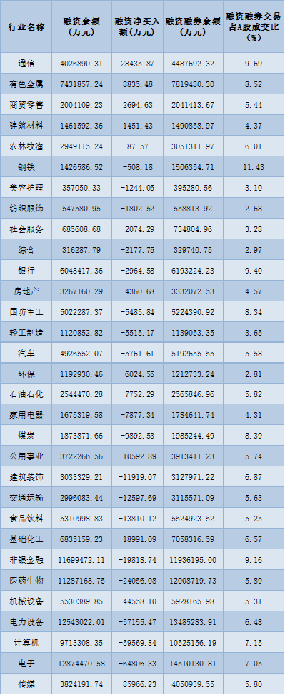 表:7月7日申萬一級(jí)行業(yè)兩融交易情況