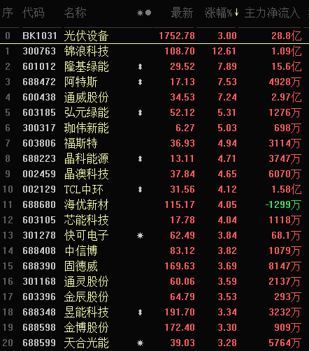 從早盤表現(xiàn)強(qiáng)勢(shì)的光伏設(shè)備行業(yè)看,交易中的51只成份股中,有49只上漲,其中,有6只個(gè)股漲幅超5%。資金方面,有28.8億元大單資金凈流入該行業(yè),居第1位。