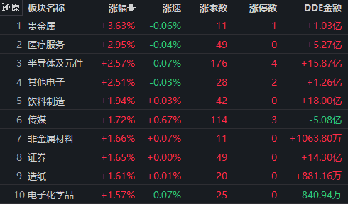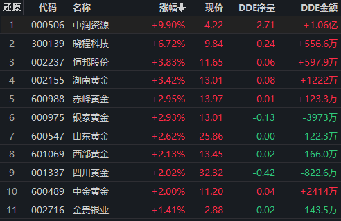 從早盤表現(xiàn)強(qiáng)勢的貴金屬行業(yè)看,交易中的11只成分股全線上漲,其中,有2只個(gè)股漲幅超5%。資金方面,有1.03億元大單資金凈流入該行業(yè),居12位。