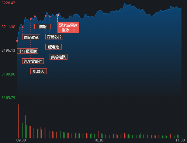 7月13日早盤,A股三大指數(shù)震蕩回升,呈深強(qiáng)滬弱格局。截至上午11:30,上證指數(shù)漲0.86%,報(bào)3223.49點(diǎn),深證成指和創(chuàng)業(yè)板指漲幅分別為1.13%和1.41%;滬深兩市成交額合計(jì)5529.2億元,較上一交易日同期增長2.46%。A股市場有3441只個(gè)股上漲,1552只下跌,漲跌停方面,有27只個(gè)股漲停,跌停股8只。