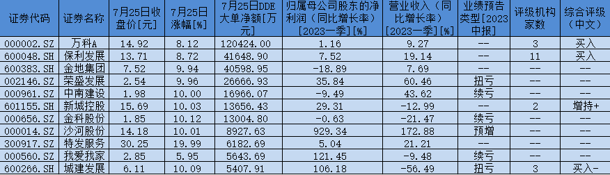 表:7月25日,房地產(chǎn)行業(yè)獲大單資金凈流入額超5000萬元個股一覽