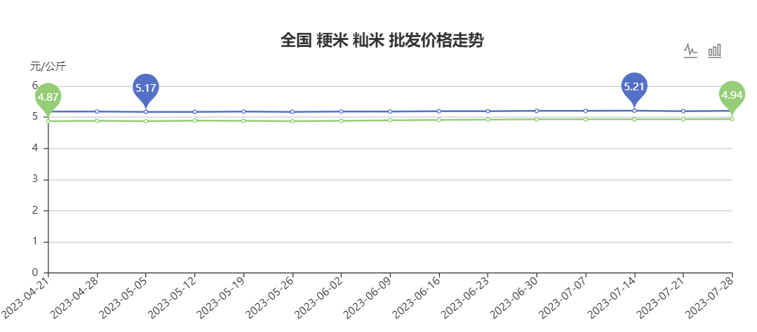 國內(nèi)方面,大米價(jià)格顯示出波瀾不驚的氣度。8月7日,國家商務(wù)部發(fā)布的全國粳米批發(fā)價(jià)格均在7元/公斤以下,山東淄博、深圳福田等地批發(fā)市場價(jià)格低于6元/公斤,全國均價(jià)約在5.2元/公斤左右,上下波動僅為0.04元/公斤。秈米批發(fā)價(jià)格均在7元/公斤以下,河南信陽、四川成都、海南等地批發(fā)市場價(jià)格低于5元/公斤,全國均價(jià)約在4.94元/公斤左右,上下波動僅為0.07元/公斤。