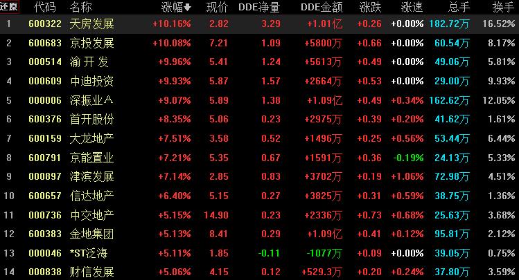 具體看,截至8月16日上午收盤,房地產(chǎn)開發(fā)板塊漲幅居首,達(dá)3.22%,資金凈流入92.37億元。其中,天房發(fā)展、京投發(fā)展、渝開發(fā)、中迪投資等個股紛紛漲停。