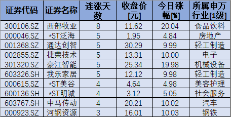 表:連續(xù)上漲3日且今日以漲停價(jià)報(bào)收個(gè)股一覽