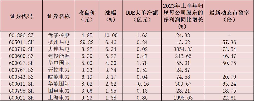 表:9月5日電力板塊內漲幅居前十的個股一覽