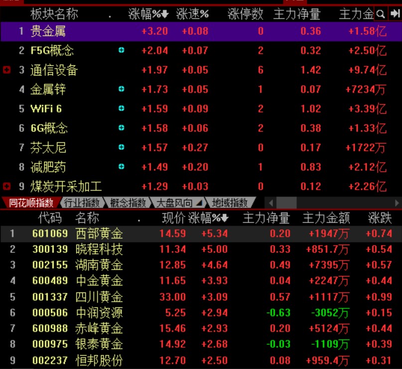 具體看,截至9月14日上午收盤,貴金屬板塊領(lǐng)漲,漲幅為3.2%,西部黃金、曉程科技、湖南黃金等個股漲幅居前三。