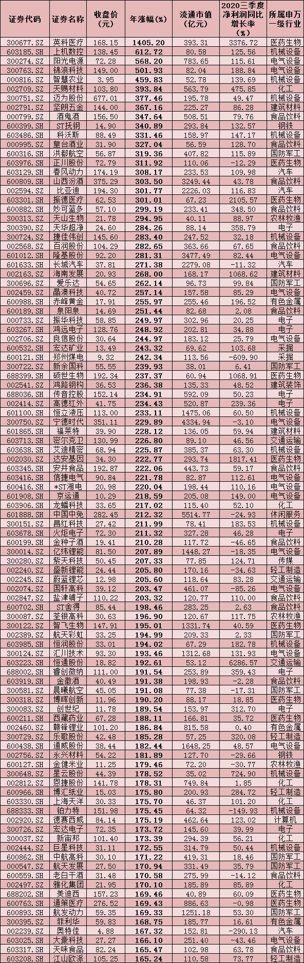 從個股方面來看,2020年的個股表現(xiàn)較為喜人。《證券日報》記者根據(jù)同花順統(tǒng)計發(fā)現(xiàn),剔除去年上市的次新股,2020年滬深兩市共有2004只個股實現(xiàn)上漲,占可交易個股總數(shù)的53.74%。其中,有255只個股累計年漲幅超過100%,股價實現(xiàn)翻番。值得關(guān)注的是,英科醫(yī)療以年內(nèi)漲幅1405.2%,位居2020年漲幅榜首位,同時也是2020年漲幅唯一超過1000%的股票。