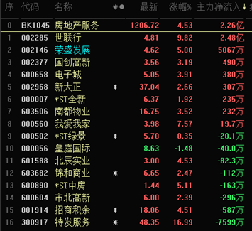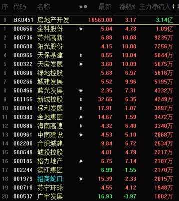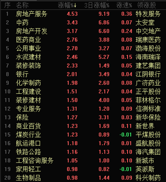 截至午間收盤,房地產(chǎn)領(lǐng)域領(lǐng)漲,細(xì)分行業(yè)房地產(chǎn)服務(wù)以4.53%的漲幅居?xùn)|方財富行業(yè)漲幅榜首、房地產(chǎn)開發(fā)則以3.17%位居第三。