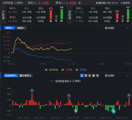 從資金面來看,3月31日上午,北向資金凈買入金額達(dá)5.31億元。兩融資金方面,截至3月30日,滬深兩市兩融余額為16796.52億元,較前一交易日增加3.76億元。其中,融資余額為15864.28億元;融券余額為932.24億元。