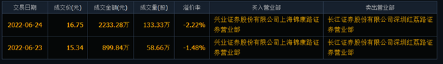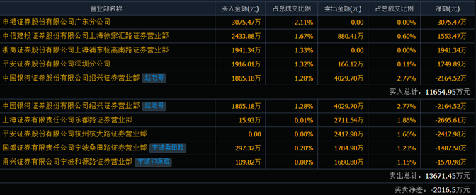 6月24日龍虎榜數(shù)據(jù)顯示,上榜的前五大買(mǎi)賣(mài)營(yíng)業(yè)部合計(jì)成交2.53億元,其中,買(mǎi)入成交額為1.17億元,賣(mài)出成交額為1.37億元,合計(jì)凈賣(mài)出2016.49萬(wàn)元。