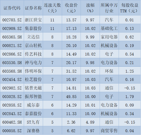 表:連續(xù)上漲5天且今日收盤(pán)漲停股一覽