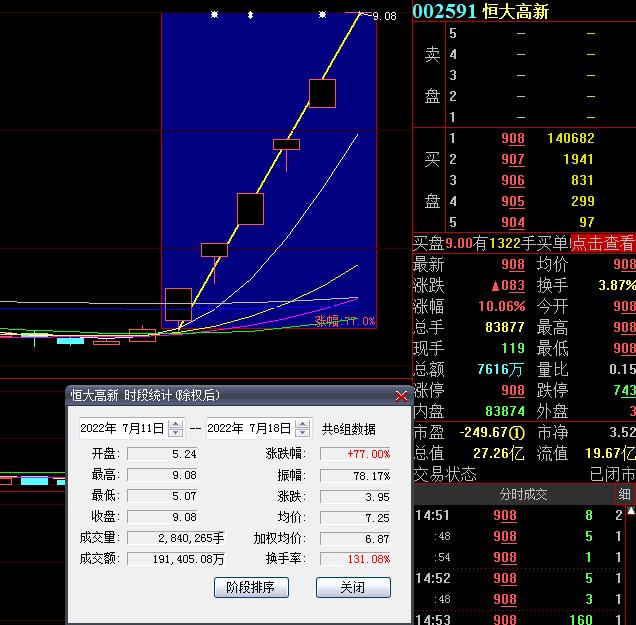 7月18日,熱門股恒大高新再度漲停,截至收盤,報9.08元,連續(xù)6個交易日漲停,期間累計漲達77%。