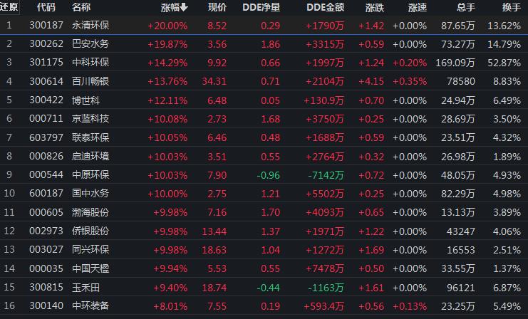 7月18日,環(huán)保行業(yè)漲幅居前,達4.59%。其中,包括中原環(huán)保、聯(lián)泰環(huán)保、永清環(huán)保、國中水務、渤海股份、京藍科技、同興環(huán)保、巴安水務等在內(nèi)的12只環(huán)保股集體漲停。