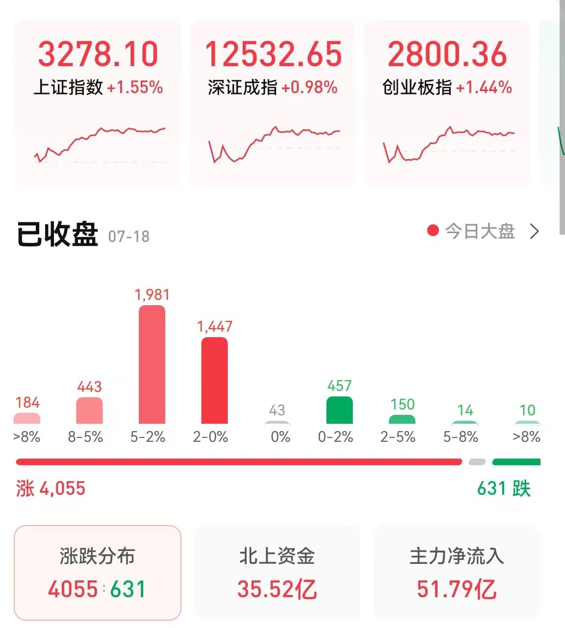 7月18日,三大股指全線上漲,截至收盤,上證指數(shù)漲幅1.55%報3278.1點,深證成指漲幅0.98%報12532.65點,創(chuàng)業(yè)板指漲幅1.44%報2800.36點;兩市合計成交10214億元,北向資金凈買入35.52億元??傮w來看,兩市個股漲多跌少,超4000只個股實現(xiàn)上漲。