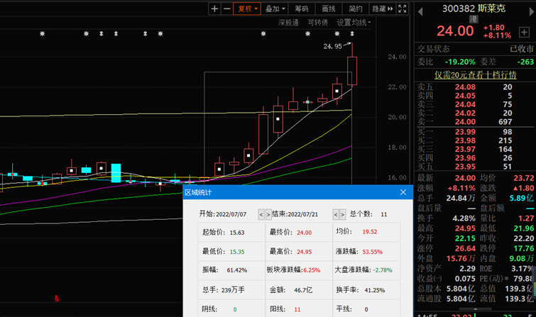 7月21日,斯萊克漲8.11%,報24.00元。該股自7月7日以來,截至7月21日已連續(xù)11個交易日上漲,累計漲幅達53.55%。