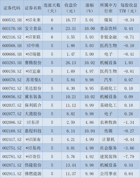 表:連續(xù)上漲5天且今日收盤漲停股一覽