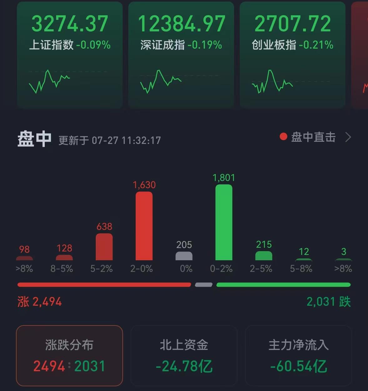周三(7月27日),三大股指震蕩回落,小幅微跌。截至上午收盤,上證指數(shù)跌幅達(dá)0.09%,報(bào)3274.37點(diǎn);深證成指和創(chuàng)業(yè)板指跌幅分別為0.19%和0.21%;滬深兩市合計(jì)成交額5274.5億元??傮w來看,兩市個(gè)股漲多跌少。